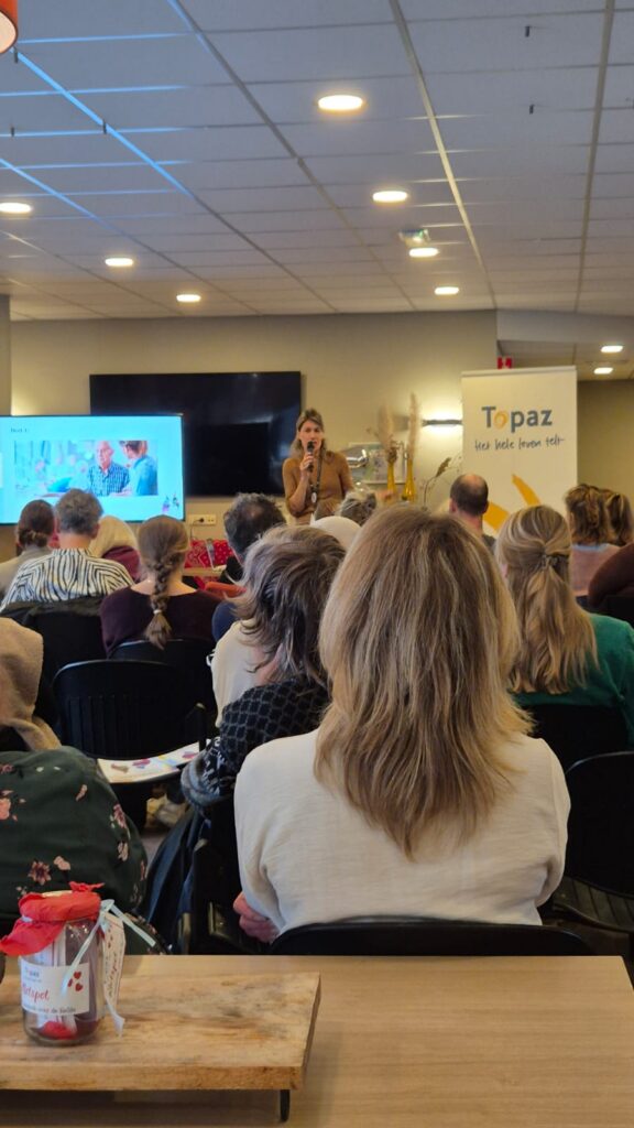 Vervolgens nam Marian Jaspers Faijer, muziektherapeut, het publiek mee in de wereld van muziek en zingeving. Zij liet op inspirerende wijze zien hoe muziek een brug kan slaan wanneer woorden tekortschieten, en hoe via klank en ritme betekenisvolle momenten van contact kunnen ontstaan bij mensen met afasie of dementie.